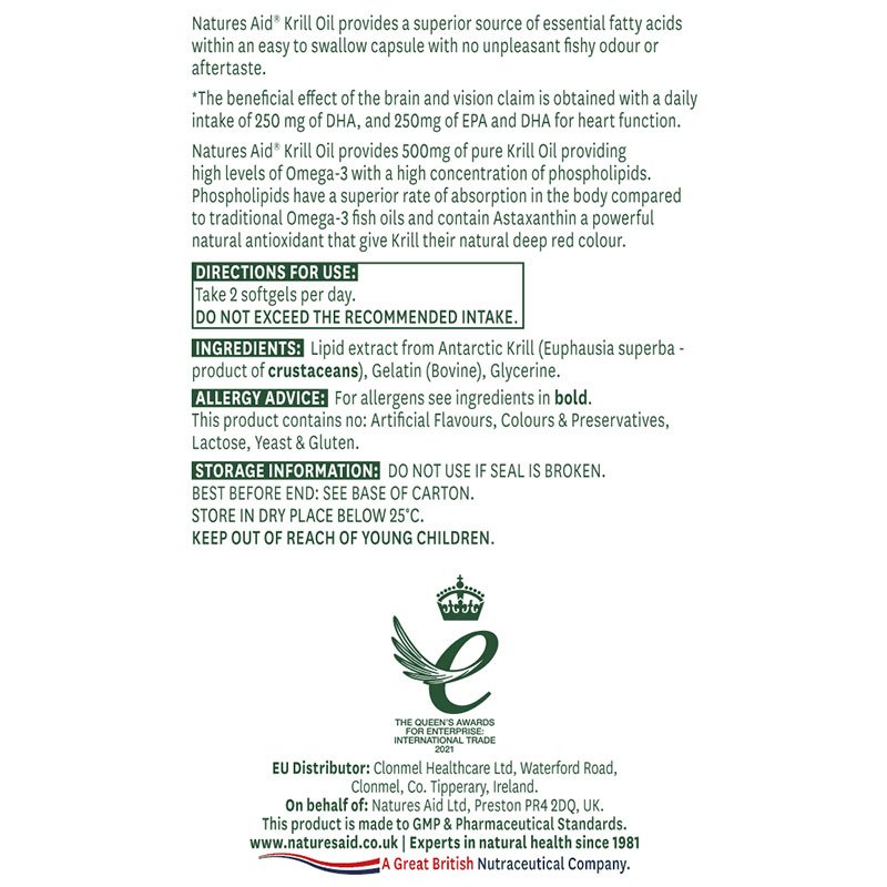 Natures Aid Krill Oil provides a superior source of essential fatty acids DHA & EPA for the normal function of the heart, brain and vision