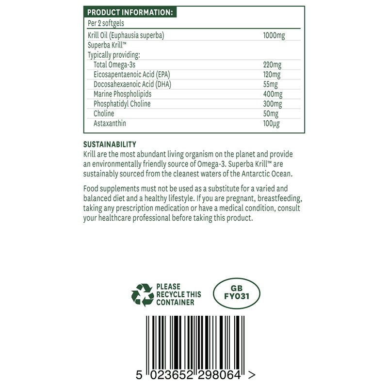 Each Natures Aid Krill Oil capsule provides 500mg of pure Krill Oil, containing high levels of Omega-3 with a high concentration of phospholipids. Phospholipids have a superior rate of absorption in the body, compared to traditional Omega-3 fish oils, and contain Astaxanthin – a powerful natural antioxidant which gives Krill their natural deep red colour.